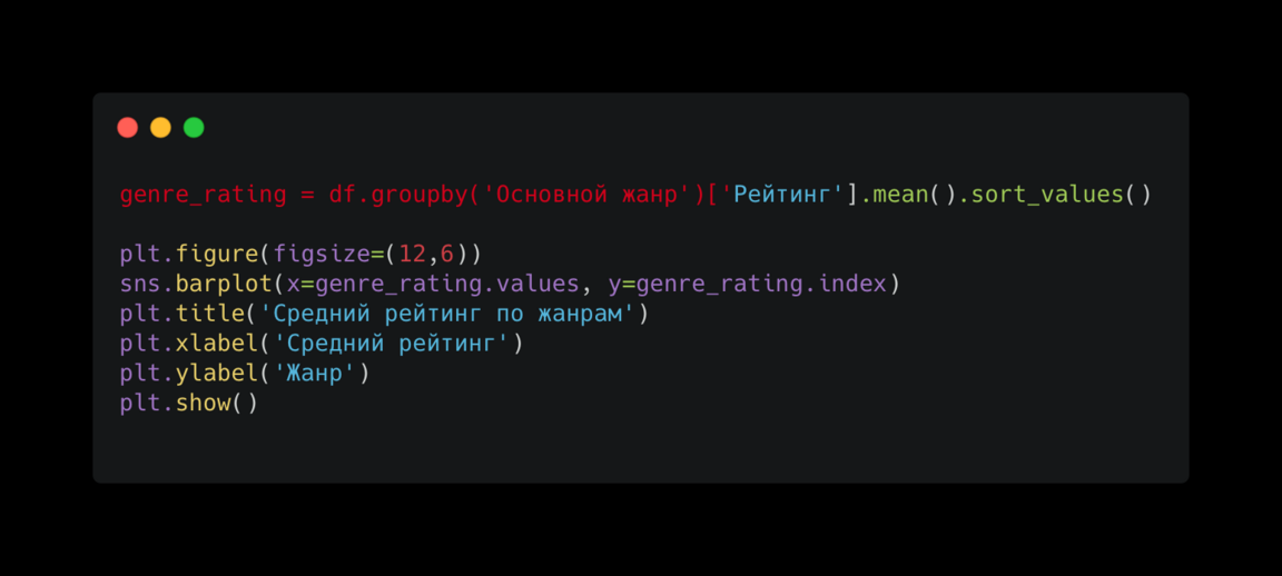 Средний рейтинг по жанрам был рассчитан с использованием группировки данных методом groupby (), после чего для каждого жанра вычислялось среднее значение рейтинга через функцию mean (). Полученные результаты были отсортированы по величине рейтинга с помощью sort_values (), что позволило визуализировать жанры в порядке убывания. Для построения диаграммы использовалась функция sns.barplot (), обеспечивающая наглядное сравнение средних значений.