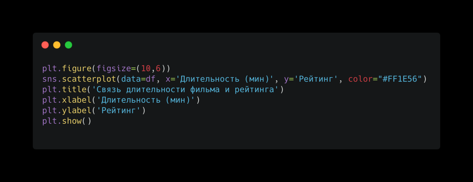 Для анализа взаимосвязи между длительностью фильма и его рейтингом была построена точечная диаграмма с использованием функции sns.scatterplot (). Перед визуализацией были выбраны только необходимые столбцы DataFrame, что позволило избежать лишнего шума. Параметр alpha был использован для уменьшения плотности точек и повышения читаемости графика. Подписи осей были добавлены через plt.xlabel () и plt.ylabel (), а общий стиль графика задавался функцией sns.set_theme ().