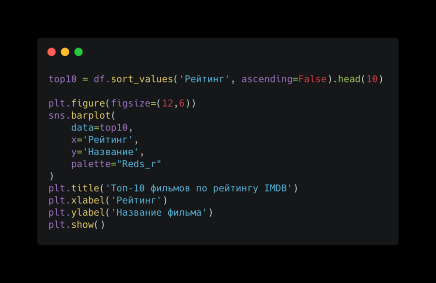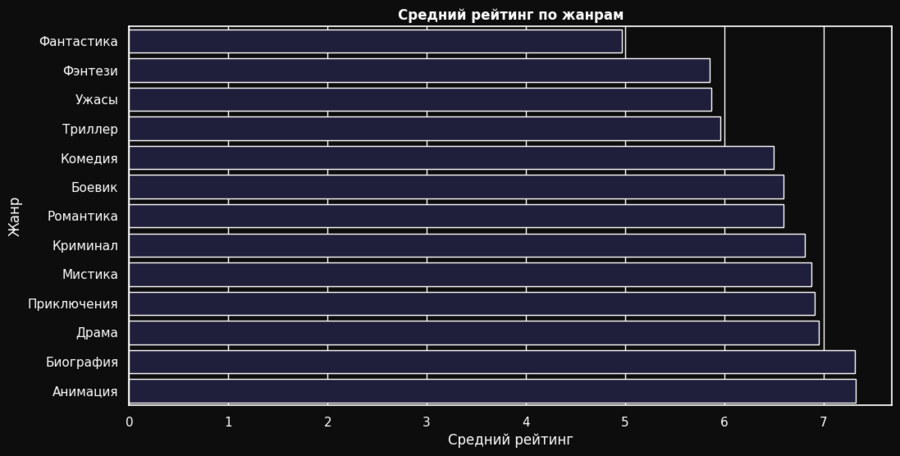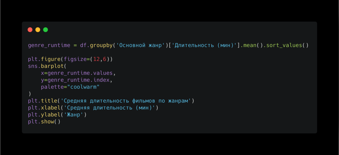 Средняя длительность фильмов по жанрам рассчитывалась с помощью группировки groupby ('Основной жанр') и функции mean (). Затем данные сортировались методом sort_values (), что позволяло визуализировать жанры в порядке увеличения или уменьшения длительности. Для построения графика использовалась функция sns.barplot (), а подписи жанров были повернуты для удобства чтения.