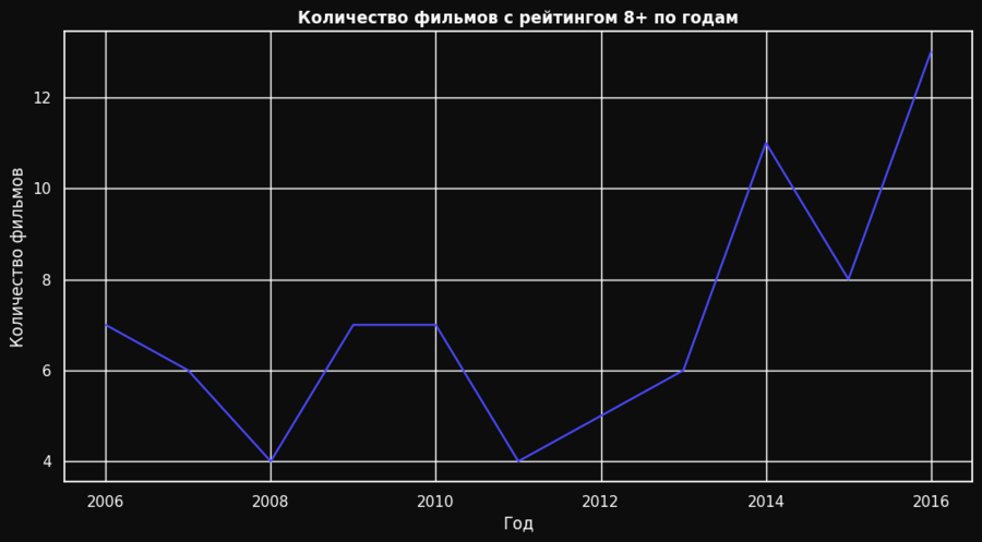 С 2006 по 2016 наблюдается рост числа фильмов с рейтингом 8+. Пик — 2016 год. Это может быть связано с развитием технологий, ростом бюджетов, глобализацией кино и усилением конкуренции между студиями.