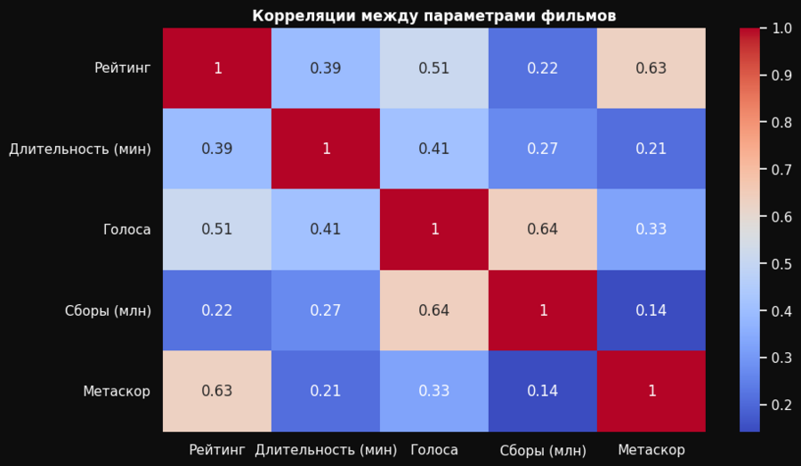 Тепловая карта. (Корреляции параметров) Этот график показывает, какие параметры фильма связаны между собой сильнее всего.