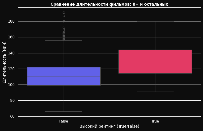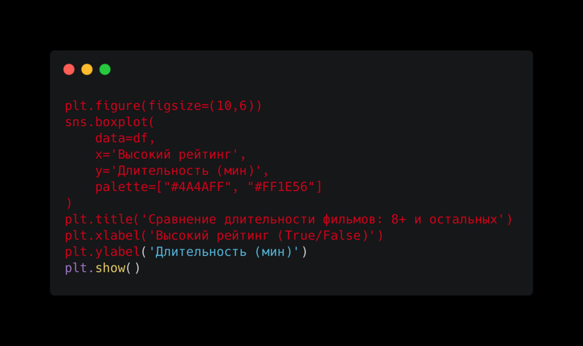 Для сравнения распределений длительности фильмов была создана бинарная метка Высокий рейтинг на основе условия df['Рейтинг'] >= 8.0. Затем с помощью функции sns.boxplot () был построен график, позволяющий визуально сравнить медиану, межквартильный размах и выбросы в обеих категориях.