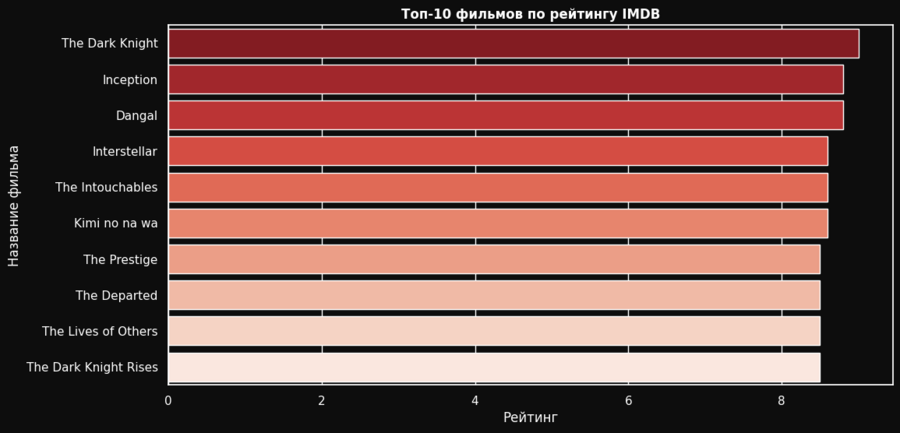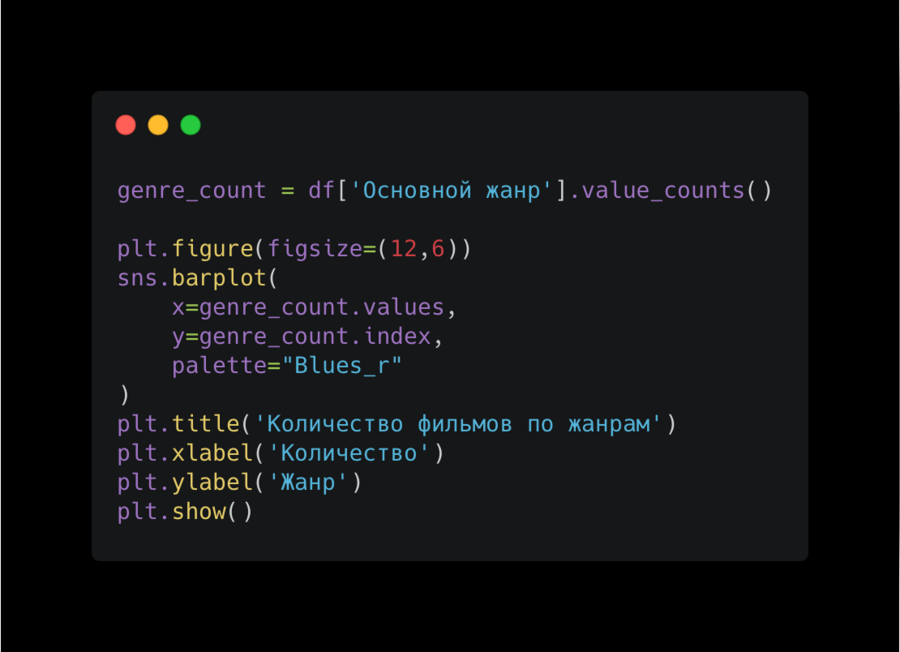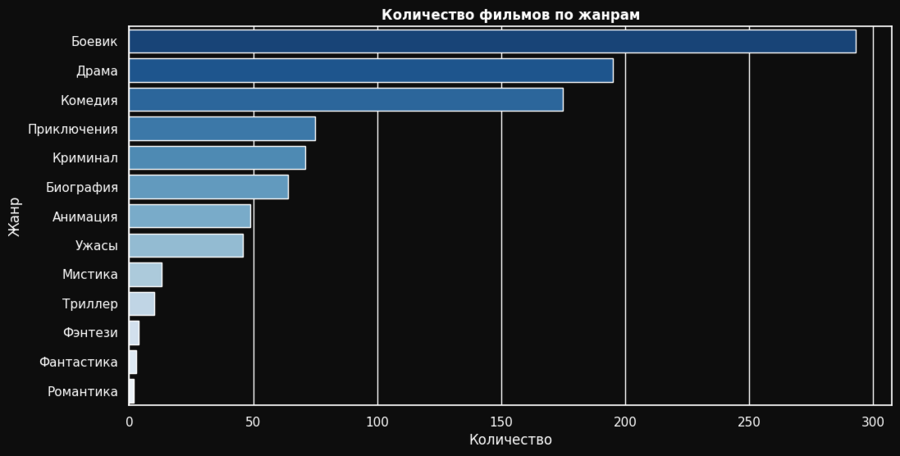 Для подсчёта количества фильмов в каждом жанре использовался метод value_counts (), после чего данные визуализировались с помощью sns.countplot (). Параметр order позволял отсортировать жанры по частоте появления, а горизонтальная ориентация (y=) обеспечивала лучшую читаемость длинных названий.