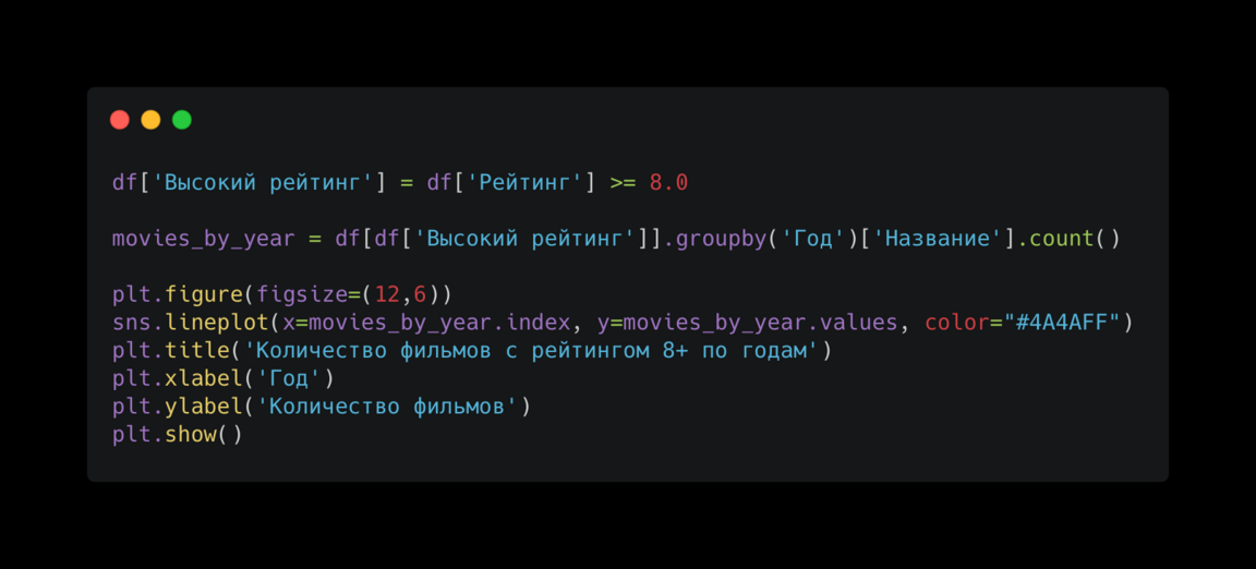 Для построения графика динамики фильмов с высоким рейтингом данные были предварительно отфильтрованы по условию df['Рейтинг'] >= 8.0. Затем количество таких фильмов по каждому году рассчитывалось с помощью value_counts () или groupby ('Год').count (). Полученные значения были отсортированы по возрастанию года методом sort_index (). Линейный график строился с использованием sns.lineplot (), а точки на линии добавлялись параметром marker='o' для повышения наглядности.