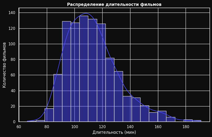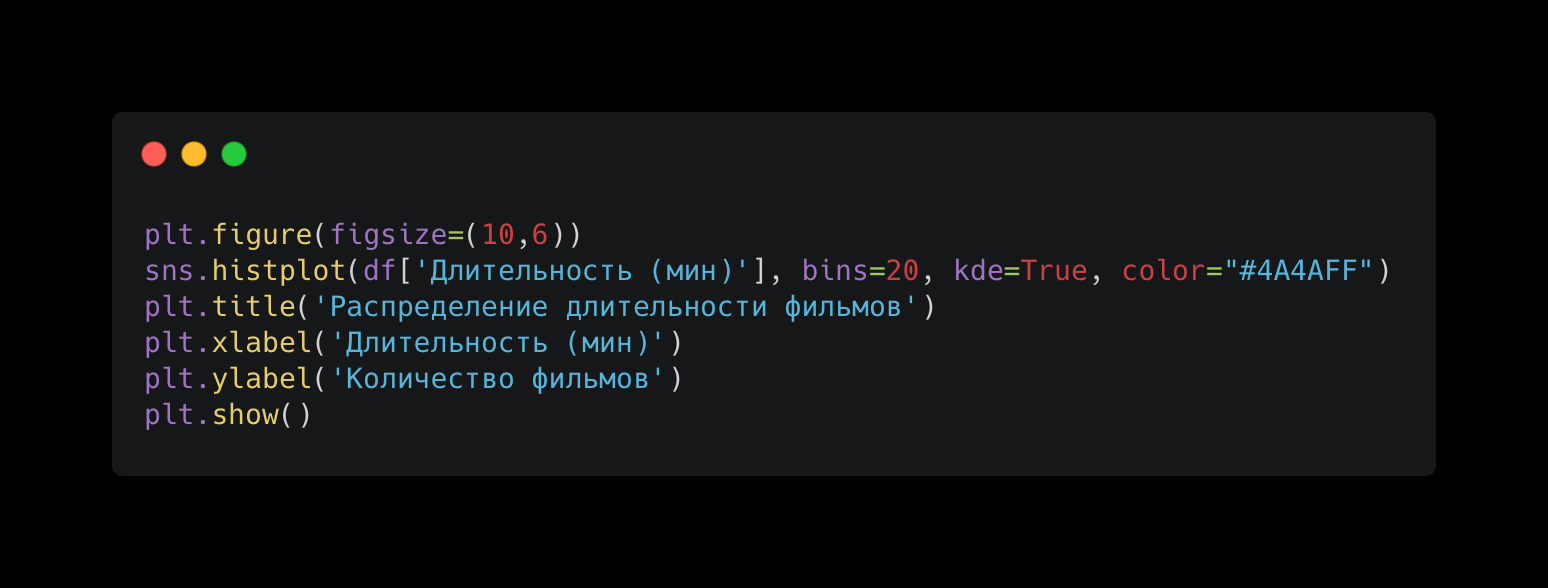 Для анализа распределения длительности фильмов использовалась функция sns.histplot (), позволяющая строить гистограммы с заданным количеством интервалов (bins). При необходимости добавлялась сглаженная линия плотности (kde=True), что помогало лучше понять форму распределения. Вертикальная линия медианы добавлялась через plt.axvline (), подчёркивая центральную тенденцию данных.