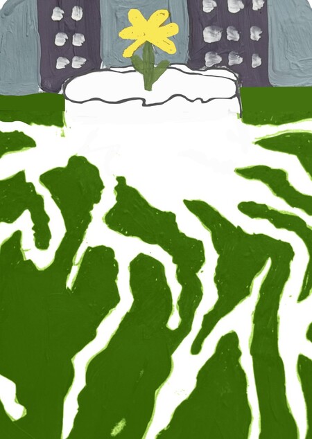 Сухой пень разделяет пространство на две части: город сверху и подземный мир корней снизу. Корни с трудом пробиваются через бетон, искажаются, ломаются. На вершине пня растёт одинокий жёлтый цветок — символ хрупкой, но упрямой жизни. Иллюстрация говорит о сопротивлении природы и её стремлении выжить даже в самых жёстких условиях.