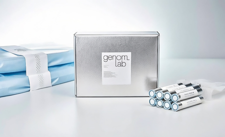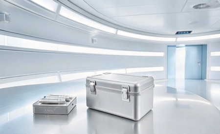 Small metallic medical sample box placed on a clean light surface in a modern laboratory environment. The box is sleek, matte silver, with a white sterile label neatly attached. Around it, a few medical vials or test tubes are visible, arranged tidily.