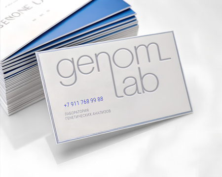 Vector mockup or 3D render of elegant business cards for a modern medical laboratory named «Genome Lab». Flat lay composition, top view, or soft 3D perspective on a smooth light background. The logo «Genome Lab» appears in refined sans-serif typography, possibly embossed or in metallic silver finish. Matte paper texture, precise alignment, minimal layout, generous whitespace.