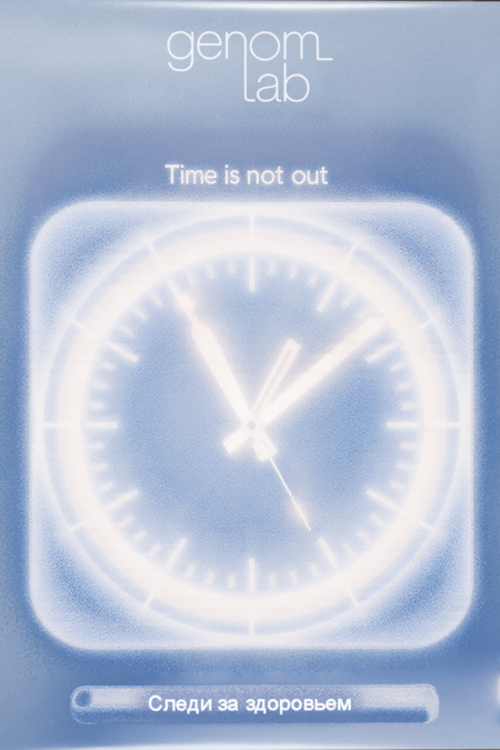 Плакат 2: The main focus is a large, elegant clock illustration — thin lines. The clock is central, drawn with fine minimalist outlines. Large typography at the top or center reads: «Time is not out» in sans-serif font. Below it, smaller text in Russian reads: «Следи за здоровьем». The layout is balanced, airy, subtle gradients.