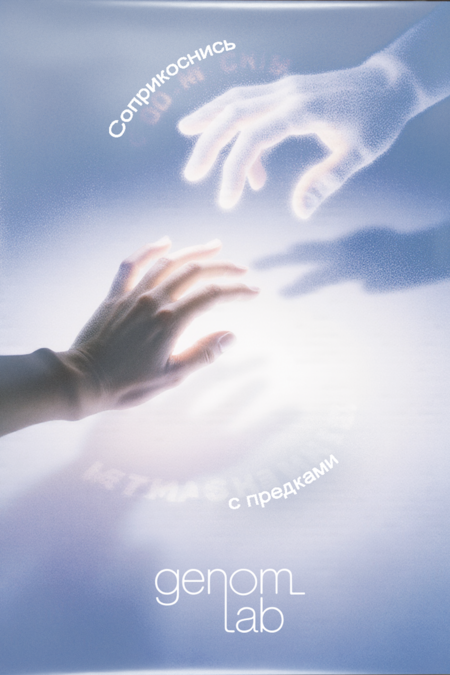 Плакат 1: A soft, diffused scene where a human hand reaches from the left toward a frosted glass surface. On the glass, a subtle gray shadow or reflection of the hand appears, slightly blurred. Gentle blur and glow around the edges, semi-transparent layers, smooth gradients, and a sense of depth and light reflection. In the composition, large text reads «Соприкоснись с предками» in sans-serif font, minimalistic and elegant.