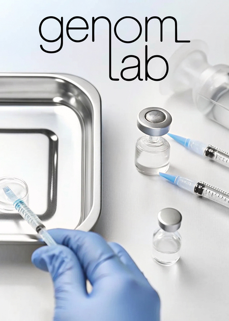 On the right — a sleek reception desk with subtle futuristic lines and a discreet «Genome Lab» logo. Next to it — a modern cloakroom area and a stylish dispenser stand with shoe covers. On the left — two comfortable armchairs and a small coffee table with magazines. The space is bright, with soft diffused lighting, smooth matte surfaces, and a minimalist aesthetic. The overall feeling is calm, hygienic, and welcoming, like a contemporary medical clinic or diagnostic center.