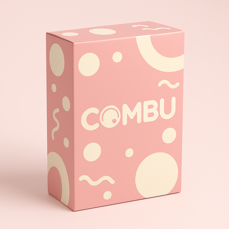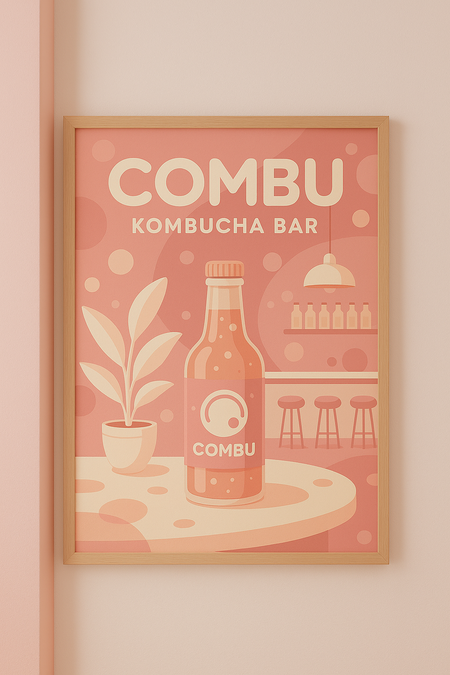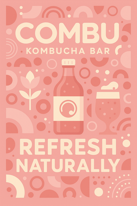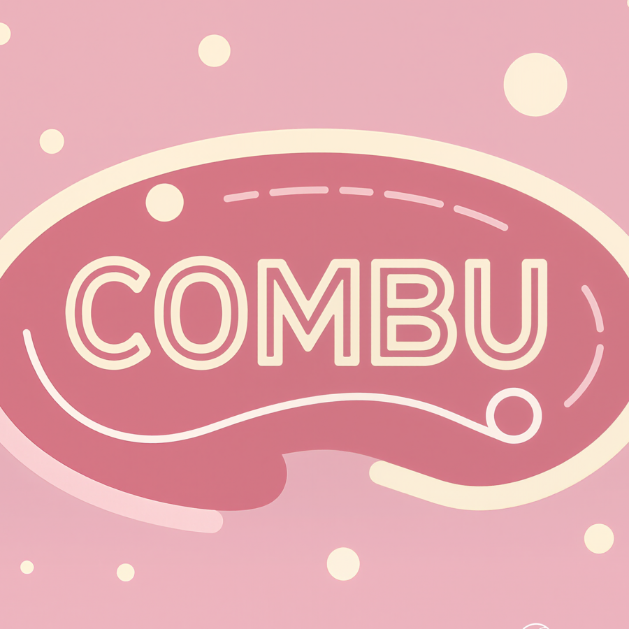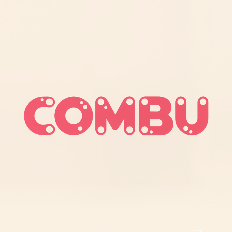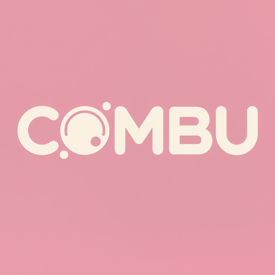 Kling AI prompt: Logo design for COMBU, a minimalist kombucha bar brand. Clean modern typography with rounded geometric letters. Subtle bubble and fermentation motif, elegant balance, soft pink and beige tones, flat vector logo for label and packaging. Calm, contemporary, natural feeling.