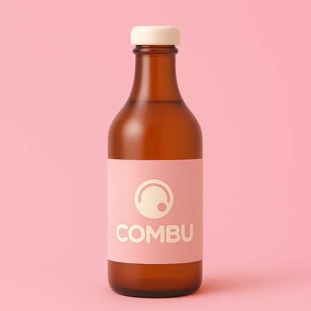 Брендированная этикетка. Prompt GPT: 3D realistic glass kombucha bottle for COMBU kombucha bar brand with soft pink and beige label design (F29BBB, F2EADF, F2C6C2). minimalist aesthetic, clean typography with COMBU logo, transparent bottle filled with light pink kombucha, standing on a soft neutral background, elegant modern look