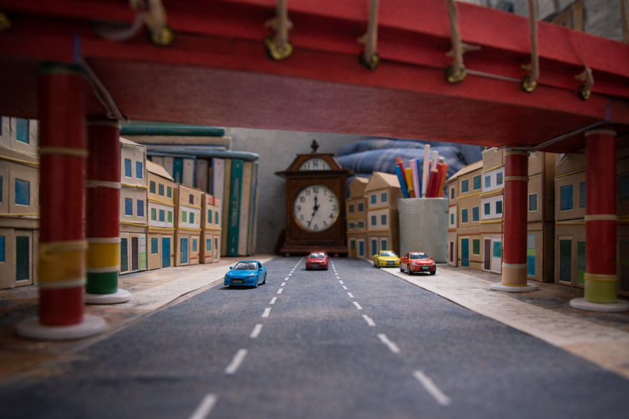 Все в локации создано из подручных предметов: Дома из книг и коробок, мост из фломастеров и картона, стопки посуды, прикроватные часы, канцелярия и игрушки.