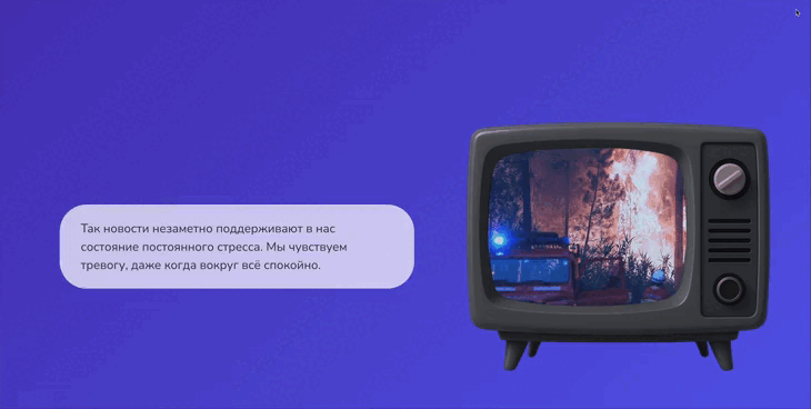 В первой половине лонгрида рассказывается, как работает наше восприятие и почему мозг склонен сильнее запоминать негативный опыт. Визуально эта часть оформлена в фиолетовых оттенках, отражающих тему тревоги и внутреннего напряжения.