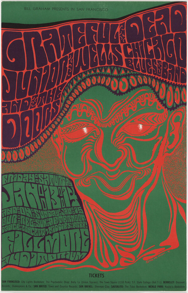 Большинство психоделических афиш работают за счёт цвета: контраст, вибрация, «обжигающие» оттенки. У Grateful Dead по-другому. Они не душат кислотными цветами. У них перегрузка смыслами.