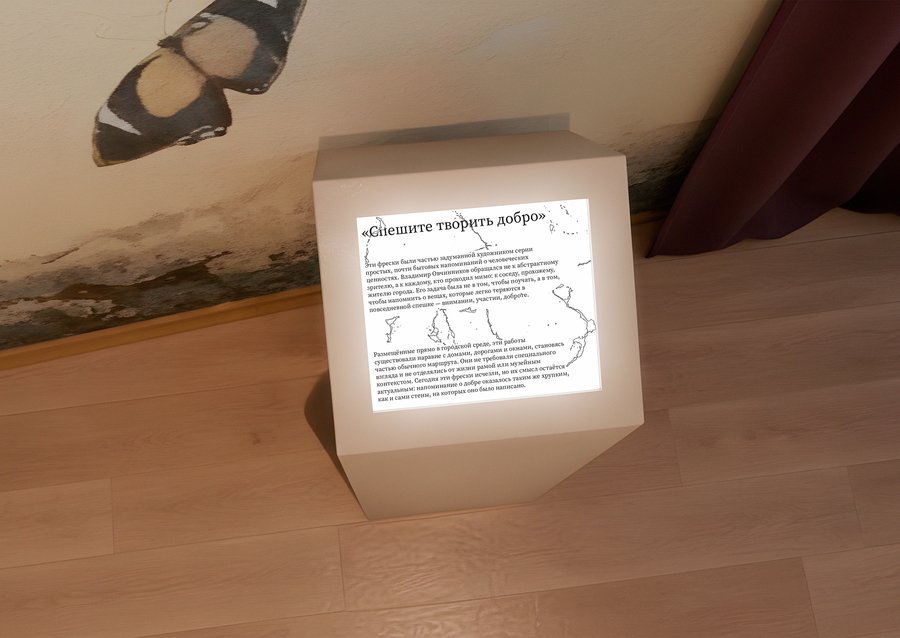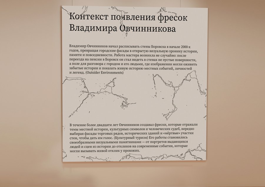 Входная зона — «Порог памяти». Краткое интро выставки, карта Боровска с отмеченными местами исчезнувших фресок. Вводит зрителя в тему утраченного искусства и задаёт эмоциональный тон.