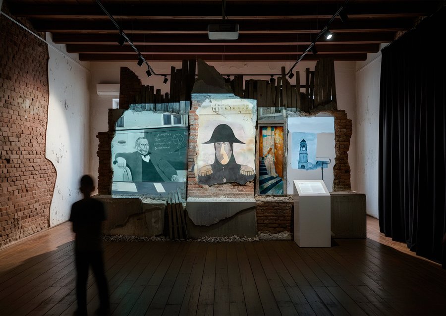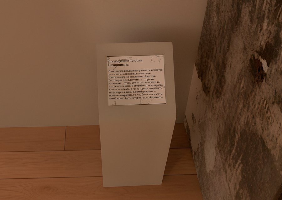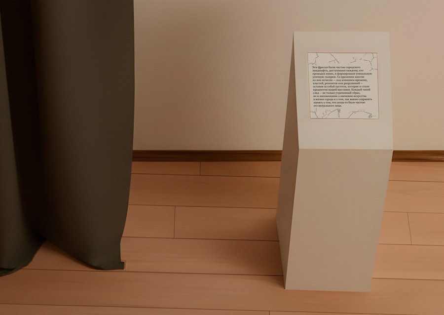 Архивная зона — «Слои времени». Контекст появления работ, коллажи старых фасадов, фрагменты текстур. В центре зала подвешены окна в которые встроенные экраны, фрески на них пропадают. Архивная зона раскрывает реальность исчезновения. Зритель впервые сталкивается с образами, которые были частью города, но уже ушли.