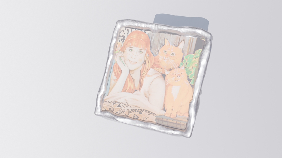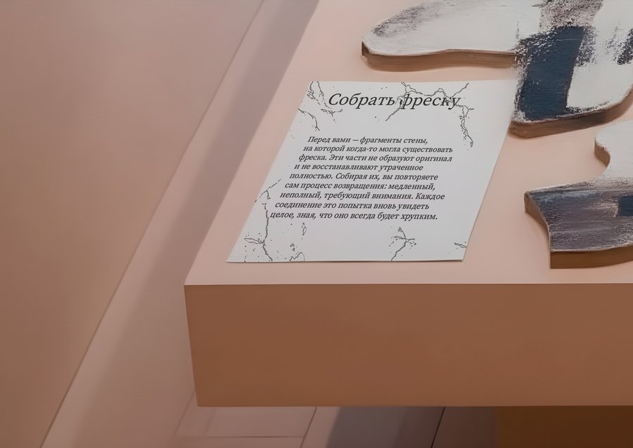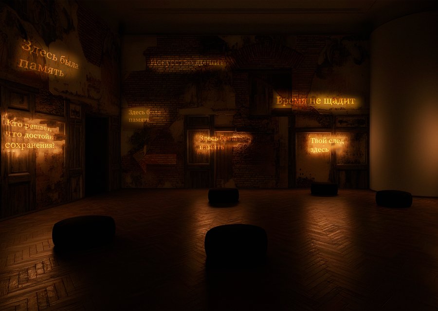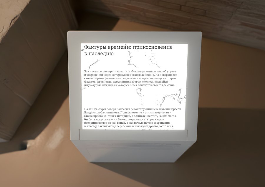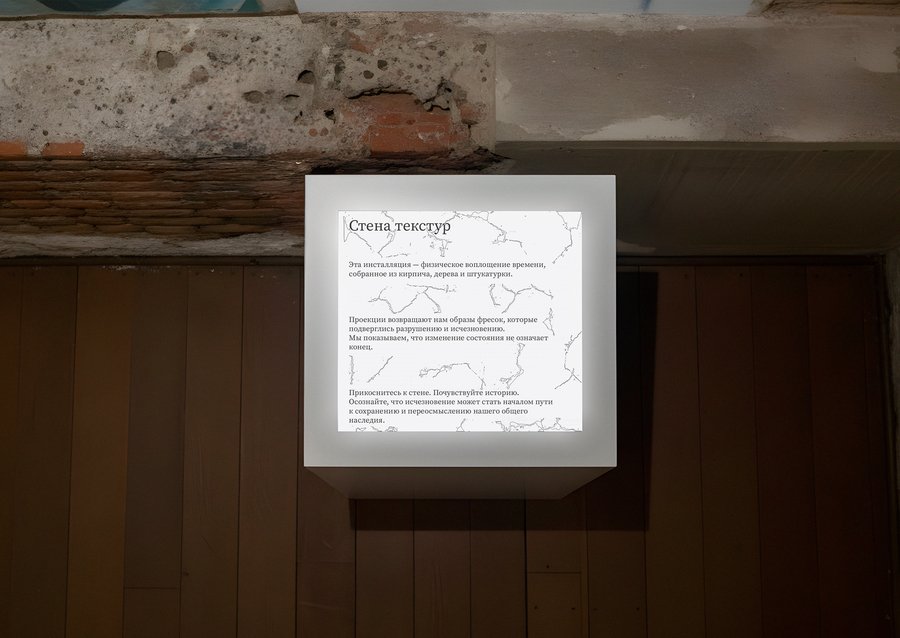Центральный объект: Фрагмент стены, собранный из разных текстур кирпич, штукатурка, дерево, облупленная краска. На ней проекции фресок, которые появляются, исчезают, дрожат, рассыпаются на пиксели. Тактильная инсталляция к которой можно прикасаться.