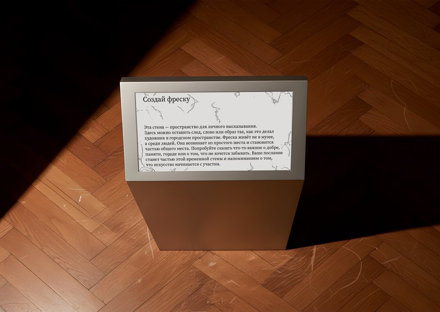 Интерактивная зона — «Создай фреску». В начале зала находится текстурная стена, на которой каждый может оставить свое послание. Далее зал состоит из панелей, кусков стен, фресок и на них проецируются фразы: «Кто решает, что достойно сохранения?», «Здесь была память», «Здесь был художник». Мы говорим о том, что каждый может помочь в сохранении фресок.