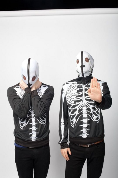 Тайлер и Джош в толстовках скелетов (слева) и фанаты в таких же толстовках (справа)