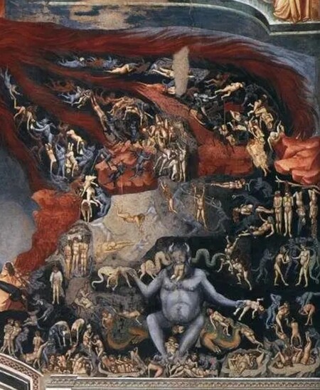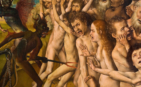 В отличие от упорядоченного строя праведников, грешники представляют собой беспорядочную массу тел. Их позы лишены гармонии: они скручены, вывернуты, падают и их тащат демоны, которые изображены не как мифические существа, а как уродливые, мускулистые твари. Это визуальная метафора насильственного отрыва души от всего земного и низвержения в небытие.