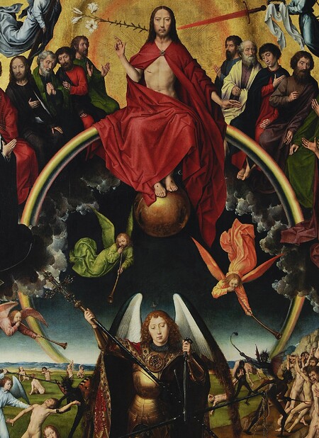 Христос-Судия как Рогир ван дер Вейдена, так и Ганса Мемлинга восседает на радуге в композиционном центре, его фигура излучает спокойное могущество. Его образ лишён драматизма, это не грозный Судья, а воплощение Высшей Справедливости. Взгляд его направлен вдаль, что создаёт дистанцию между его вечным знанием и земной суетой.