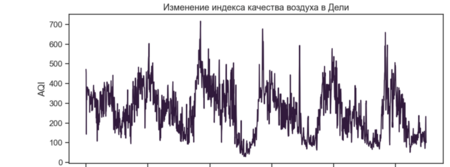 Данный линейный график отображает изменение индекса качества воздуха (AQI) во времени для выбранного города (например, Дели). По оси X отложена дата наблюдения, по оси Y — значение AQI. Этот график используется для анализа временной динамики загрязнения воздуха и позволяет: - выявить долгосрочные тренды (улучшается или ухудшается ситуация со временем); - обнаружить сезонность (повторяющиеся пики загрязнения); - увидеть экстремальные значения AQI, соответствующие периодам сильного смога.