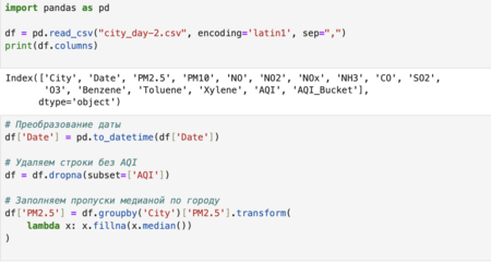 1 этап работы: загрузка и первичный анализ, очистка данных: экологические данные часто содержат пропуски, а медиана снижает влияние аномальных значений