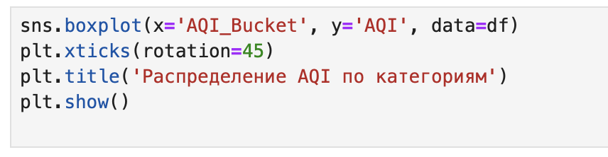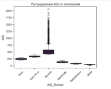 Boxplot визуализирует распределение значений AQI внутри каждой категории качества воздуха (Good, Moderate, Poor, Very Poor, Severe). Этот график позволяет: - сравнить диапазоны значений AQI между категориями; - выявить перекрытия и выбросы; - оценить, насколько корректно категории отражают реальные числовые значения. Этот график особенно полезный для анализа экологических данных с выбросами.