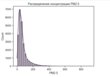 Гистограмма отображает распределение значений концентрации PM2.5 — одного из наиболее опасных загрязняющих веществ. По оси X — концентрация PM2.5, по оси Y — количество наблюдений. Этот график позволяет: - понять, какие значения PM2.5 встречаются чаще всего; - оценить, насколько часто фиксируются опасные уровни загрязнения; - определить, является ли распределение симметричным или имеет длинный «хвост» экстремальных значений. Гистограмма помогает перейти от отдельных измерений к пониманию общей картины загрязнения воздуха и показывает, является ли высокий уровень PM2.5 редким или типичным явлением.