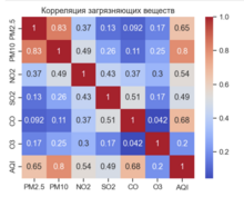 Тепловая карта отражает корреляции между концентрациями загрязняющих веществ и AQI. Цвет ячеек показывает силу и направление связи. Этот график помогает: - определить, какие загрязнители сильнее всего связаны с ростом AQI; - выявить взаимосвязи между разными веществами; - сделать выводы о ключевых факторах ухудшения качества воздуха.