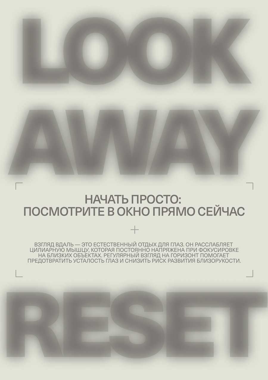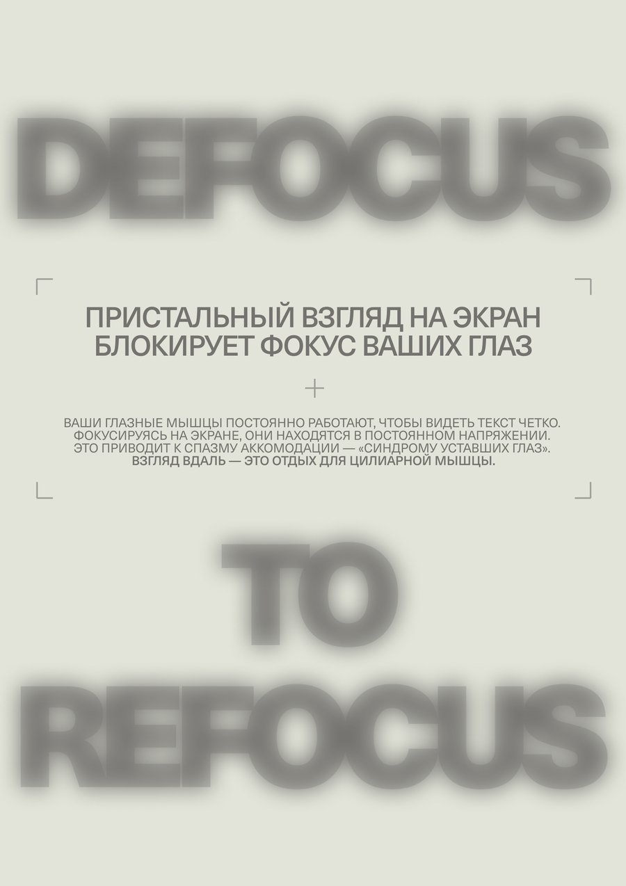 A series of posters on compilation and digital overworking of the eye. The visual prima, in the form of blues, encourage the audience to pay attention to the problem of «focusing» the eyesight — a person needs to constantly change the focus from a short distance to a deluxe.