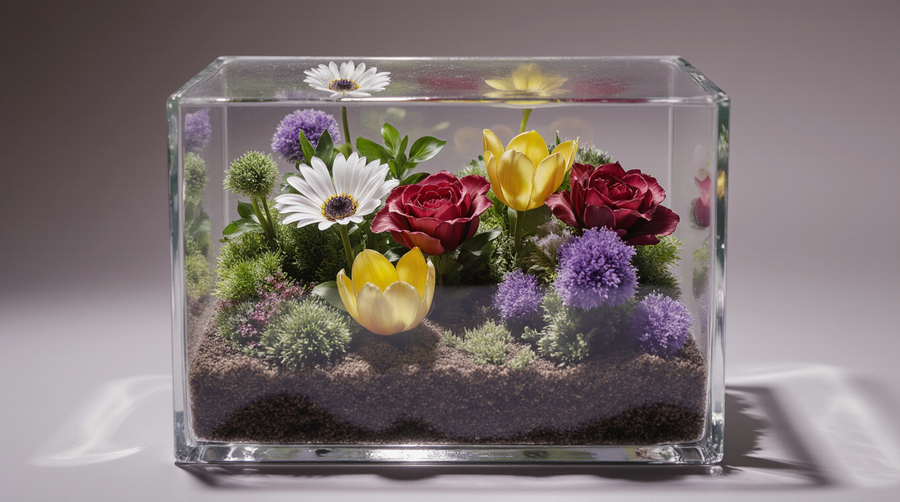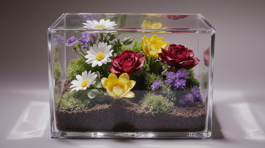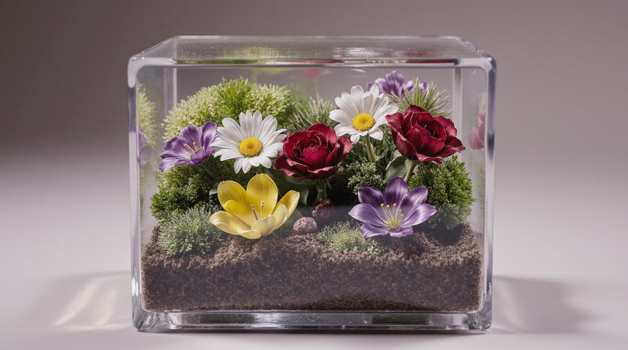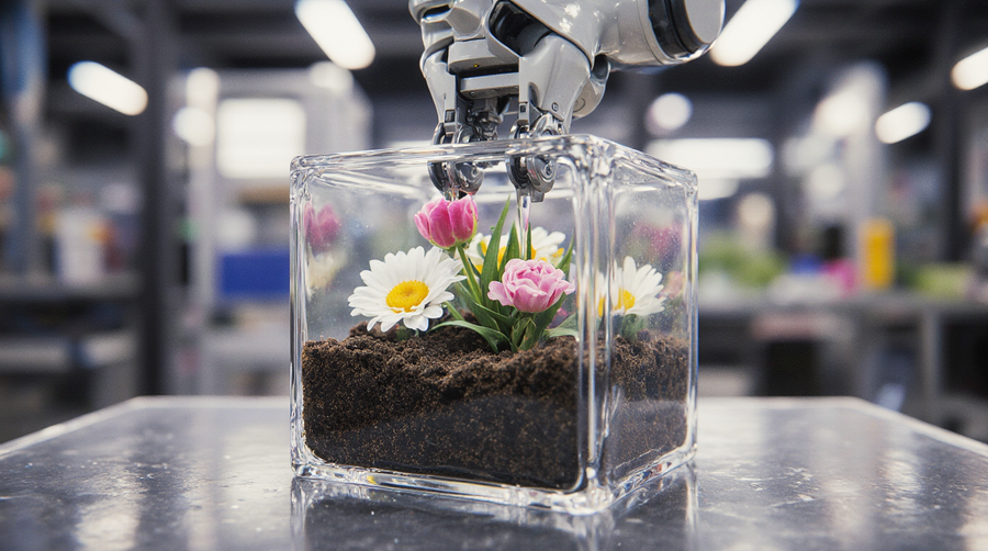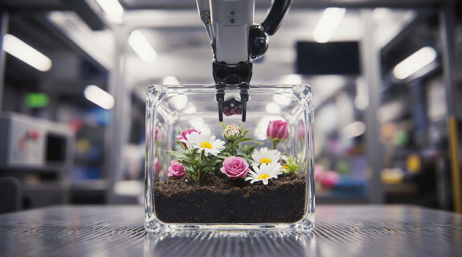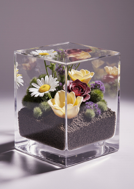 1.Визуализация: Модель — Krea 1 Image | Krea Promt: [Hyperrealistic close-up shot of a rectangular box with crystal clear walls. Inside, a vibrant miniature ecosystem of flowers is thriving and growing directly from soil. Detailed white daisies, deep red roses, bright yellow and purple tulips, and assorted green foliage and fantastic flowers. Soft studio lighting, volumetric light, shallow depth of field, blurred background, 8K, cinematic quality.]. Styles: «caustics_and_subsurface_Scattering» --iw 0.36; «Glitterihg Ahgels» --iw 0.45. Promt generation: Model — GPT-5 Promt: [напиши промт для генерации коробки с прозрачнвми стенками, внутри которой растут цветы такие, как ромашки, розы тюлбпаны и другие]. 2. Пространство: Модель — – Krea 1 Image | Krea Promt: [Hyperrealistic 3D render, close-up shot. A transparent acrylic box, half-filled with rich soil and actively growing flowers (daisies, roses, tulips), is positioned at an assembly station on a factory floor. A robotic arm with delicate grippers is carefully placing another flower or a small plant into the box. Bright, focused task lighting from above highlights the intricate details of the flowers, the texture of the soil, and the subtle reflections on the acrylic. In the blurred background, other industrial machinery, metal structures, and fluorescent lights of the workshop are visible. The scene emphasizes precision and the fusion of nature and technology. Ultra-high resolution, 16K, sharp focus, industrial aesthetic, clean yet functional environment]. 3. Айдентика: - Логотип: Модель — Krea 1 Image | Krea Promt: [sticker with a white outline on a white transparent background wax logo flower. without text.]. Styles: «Gradient graphics» --iw 0.44; «organic line» --iw 0.35; «caustics_and_subsurface_Scattering» --iw 0.8. Шрифт: «Century Gothic». Распознание цветов: Adobe Color Цвет темы из изображения | Adobe Color.