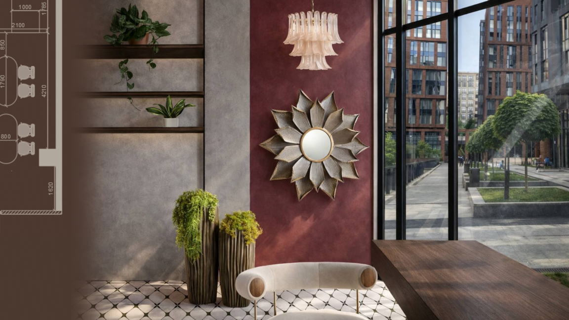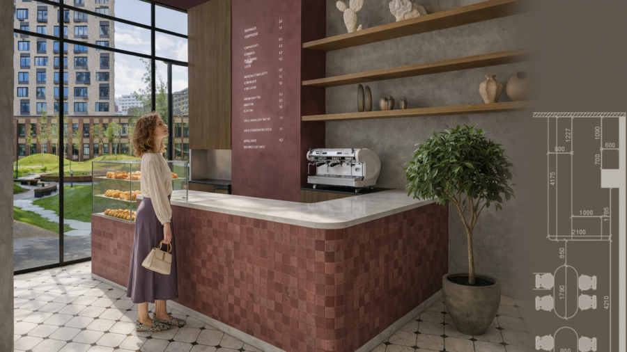 • Площадь помещения: 72,8 м². • Архитектурные особенности: высокие стены, хорошая естественная освещённость. • Две стены представляют собой панорамное остекление в пол. • Кофейня расположена в городском пространстве (уточнение для визуальных решений). • Требуемый стиль: нежные оттенки, натуральные материалы, акцент на текстурах камня, плитки, добавление зелени.
