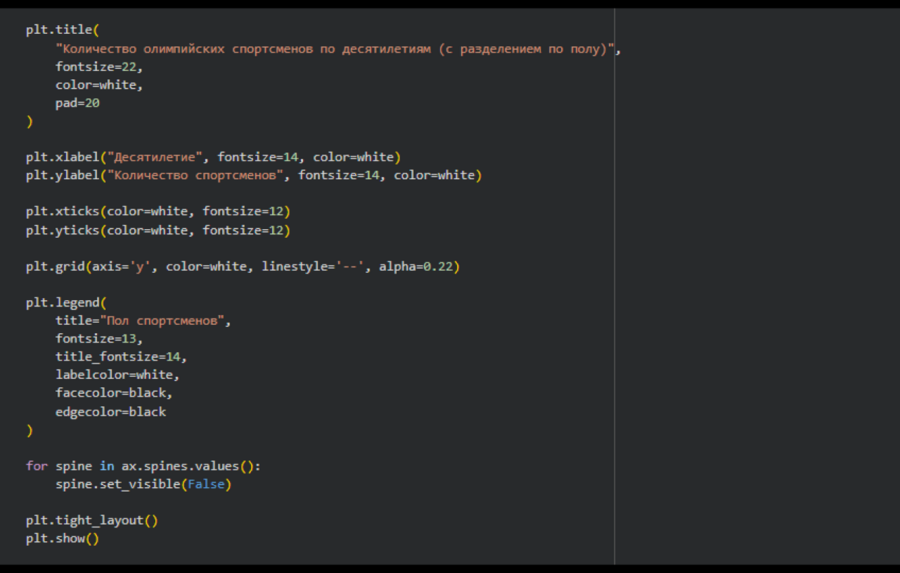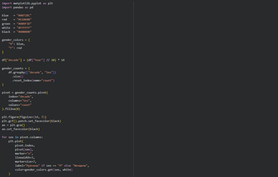 — реализован с помощью линейных графиков, отражающих изменение численности спортсменов по десятилетиям. Такой подход позволил выявить долгосрочные тенденции роста и изменения гендерной структуры олимпийского движения.