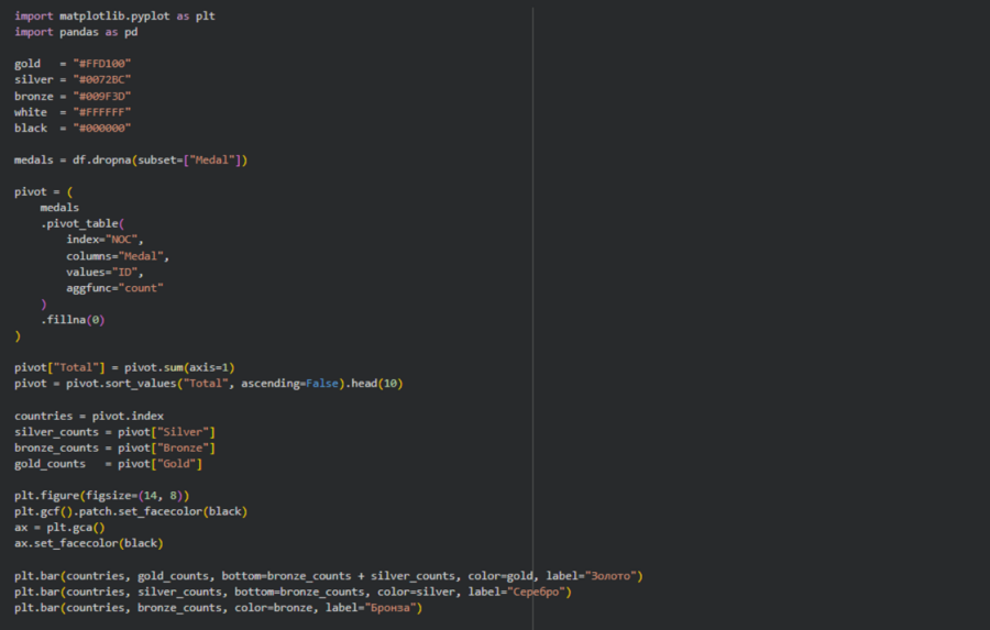 — использовался при анализе распределения олимпийских медалей по странам и типам наград (золото, серебро, бронза). Стековая столбчатая диаграмма позволила одновременно оценить как общий объём медалей, так и вклад каждого типа награды.