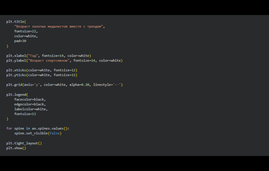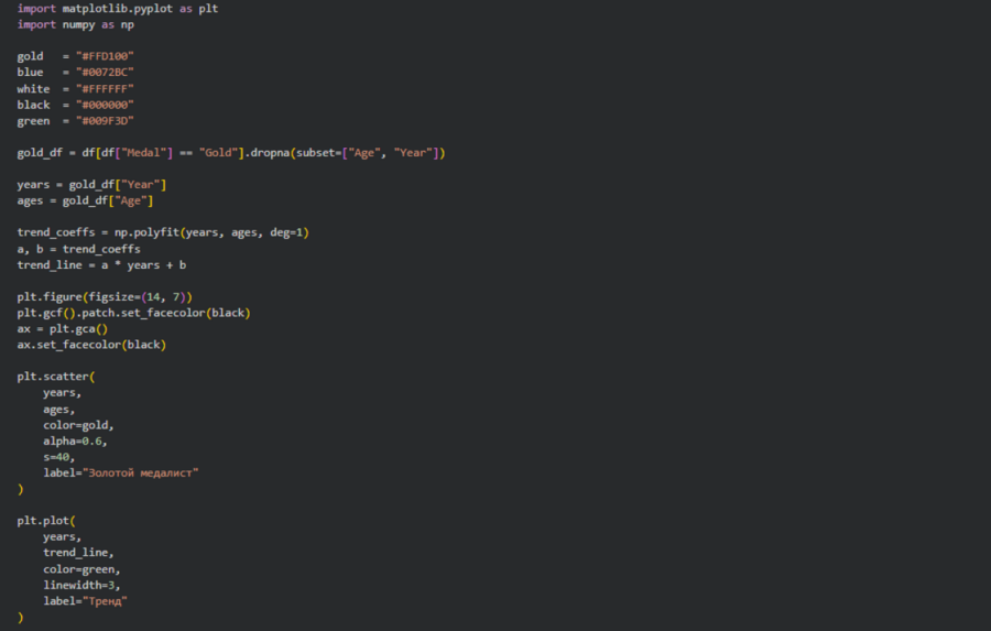 — проведён с использованием линейной регрессионной аппроксимации, что позволило выявить общую тенденцию изменения возраста золотых медалистов на протяжении рассматриваемого периода.