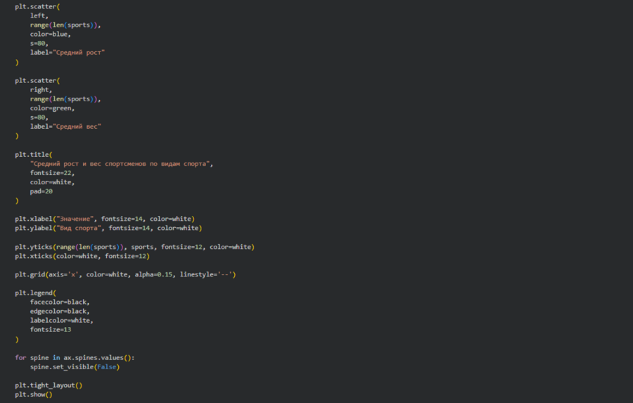 — реализован с помощью парных сравнений (slopegraph), что позволило наглядно сопоставить средние значения роста и веса внутри каждого вида спорта и оценить различия между дисциплинами.