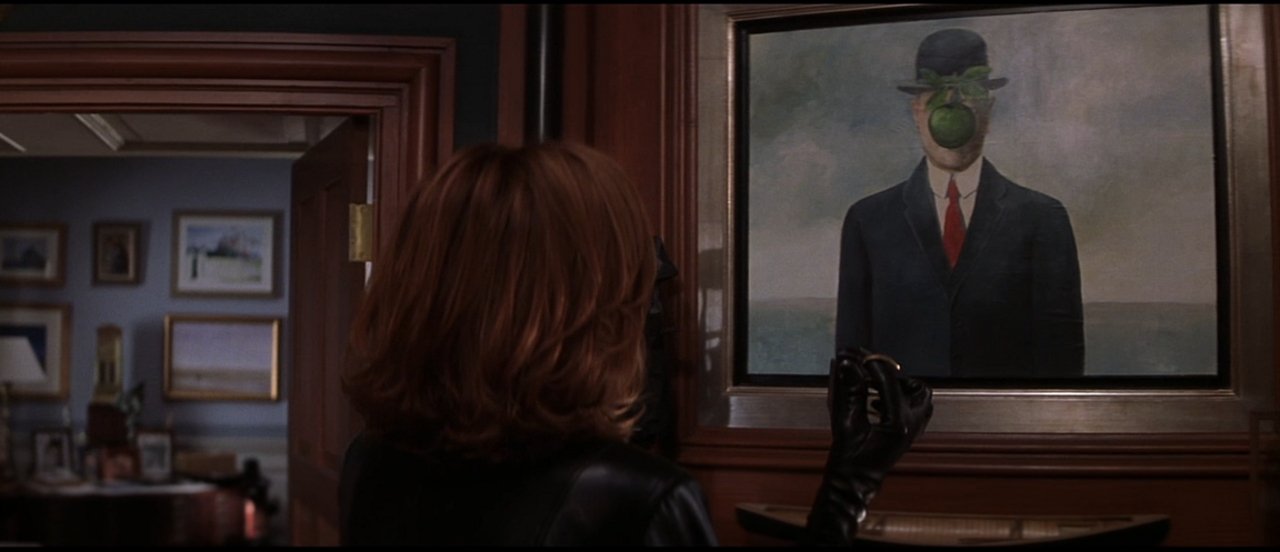 Другим ключевым образом становится картина «Сын человеческий» Рене Магритта, которая висела в квартире Крауна. В кульминации полотно Магритта будто оживает и десятки мужчин в котелках заполоняют музей и позволяют Крауну скрыться. Так, акт кражи превращается в перформанс.