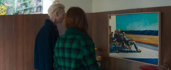 «В комнате по соседству» Педро Альмодовар вновь обращается к живописи как к своеобразному компасу, которые помогает понять эмоциональную направленность героинь. Живопись становится будто оптикой одиночества. Один из главных визуальных образов — картина Эдварда Хоппера «Люди на солнце». Фигуры людей, лежащих на шезлонгах под невидимым солнцем, схожи с образами двух главных героинь — они находятся рядом, однако все равно не могут полноценно почувствовать состояния друг друга. Альмодовар несколько раз цитирует живописца, в том числе и в кульминации, где одна из главных героинь умирает на этом самом шезлонге, лежа под солнцем.