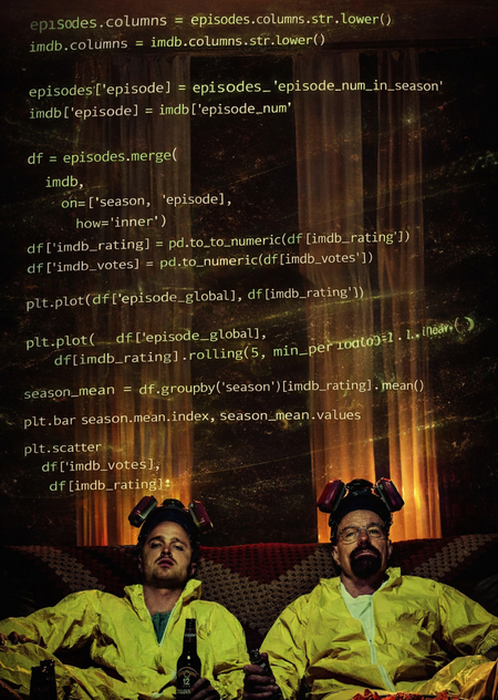 В этом проекте анализируется сериал Breaking Bad на основе открытых данных IMDb. Цель исследования — понять, как менялось качество сериала по ходу выхода эпизодов, насколько стабильно оценивались сезоны и существует ли связь между популярностью эпизода и его рейтингом. Проект выполнен в формате изучающей и объясняющей визуализации данных с использованием Python и библиотеки Pandas.