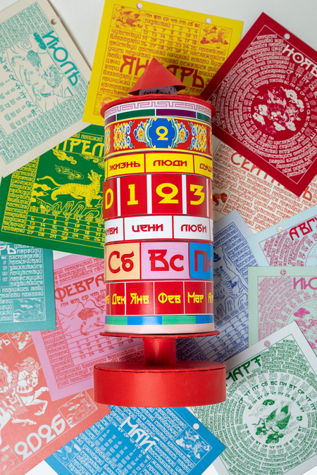 The second calendar is presented as a Buddhist prayer drum. It’s about physical interaction. Every section spins around, a person builds a date on his own, which makes the calendar endless. Two sections of the calendar are special: the first is filled with nouns, life — related, and the second with stimulating verbs.