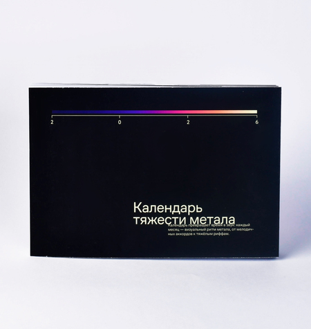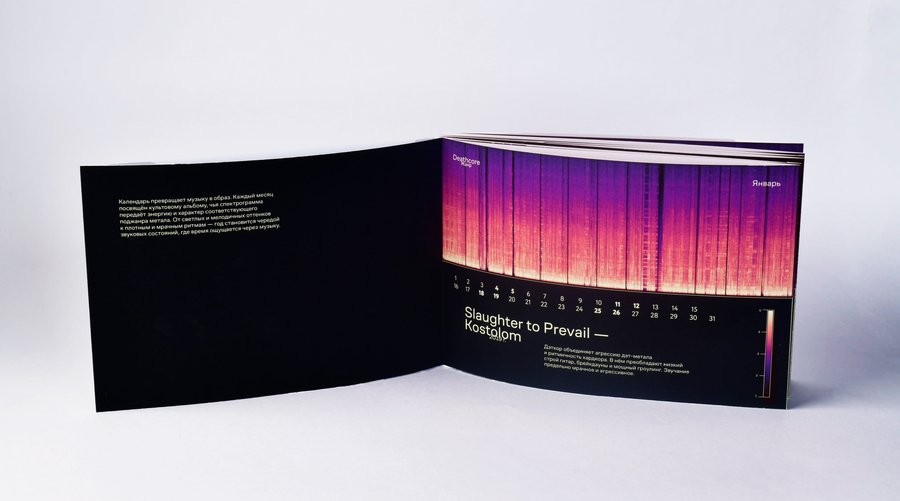 Календарь выполнен в виде длинной горизонтальной ленты, метафорически отражающей непрерывное течение времени и звучания. Каждый месяц представляет собой спектрограмму культового альбома, где цвет и плотность линий визуализируют частоту и интенсивность музыки. Логика календаря строится на постепенном переходе звука: зимние месяцы сопровождаются более тяжёлыми альбомами, а летом звучание становится легче