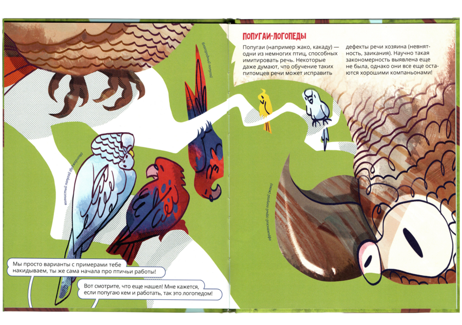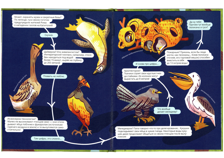 В конце своей прогулки герои начинают фантазировать, какие еще профессии подошли бы пернатым друзьям.