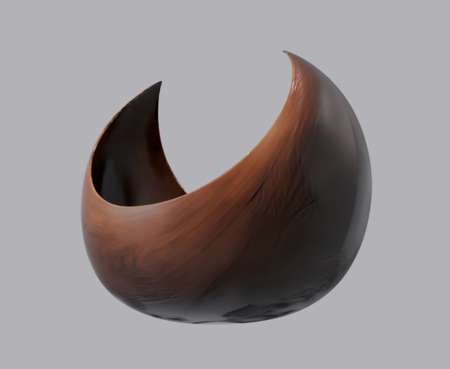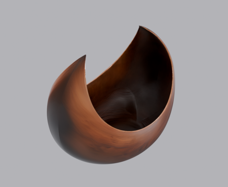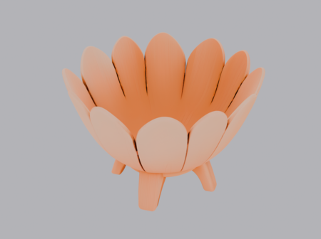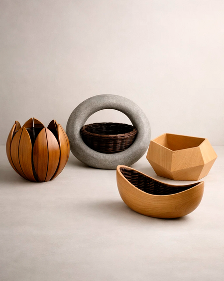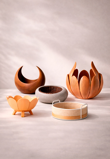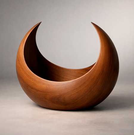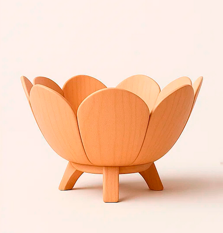 3D concept render of a basket shaped like an opening flower bud, curved petal-like wooden segments, organic smooth silhouette, flowing biomorphic design, elegant materials, soft lighting, no text