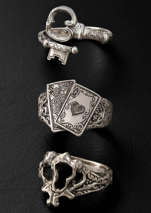 Массивное кольцо с картами отсылает к карточной колоде и Королеве Червей. Оно про хаос, правила, которые постоянно меняются, и игру, в которой невозможно предугадать исход. Сердце на карте — символ эмоций, риска и уязвимости в мире абсурда.