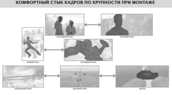 На рисунке показан комфортный стык кадров по крупности: 2й средний план + Крупный план Общий план + 1й средний план Сверхобщий план + Дальний план + Деталь