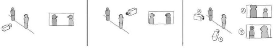 Правило гласит, что при диалоге двух персонажей камера не должна «залетать» за линию, проходящую между этими персонажами. Если камера перескочит с зелёной зоны на красную, зритель может запутаться в персонажах или их таинственной «взаимо-телепортации». Правило 180 градусов распространяется не только на диалоги. Если персонаж идет или бежит, то линия — это направление его движения. Если камера «перелетит» через линию, у зрителя создастся впечатление, что персонаж поменял направление и теперь бежит навстречу самому себе. Если персонаж читает, то линия проходит между глазами и книгой. Если в кадре батальная сцена, то один противник должен быть с одной стороны, второй — с другой. Пересечь эту линию мы можем лишь «перелетев» ее физически вместе со зрителем, чтобы он четко осознавал перемещение в пространстве.
