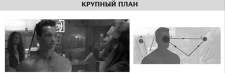 В крупном плане у персонажа видны голова и шея, иногда плечи. Генетически сложилось, что люди в первую очередь замечают человеческое лицо и смотрят сразу на него. Даже если человек сидит в кафе или в автомобиле за стеклом, то мы всегда замечаем его лицо. Крупный план создан для показа эмоций героя, диалогов между актерами. Видны некоторые детали, помогающие понять историю героев. Чем крупнее показан план, тем больше внимания на нем сфокусировано. Детальный план используется для того, чтобы показать и усилить какую-то важную деталь сюжета. Наше внимание приковано к конкретной детали, на которой режиссер или художник ставит акцент. Фон тут имеет минимальное значение или он почти неразличим.